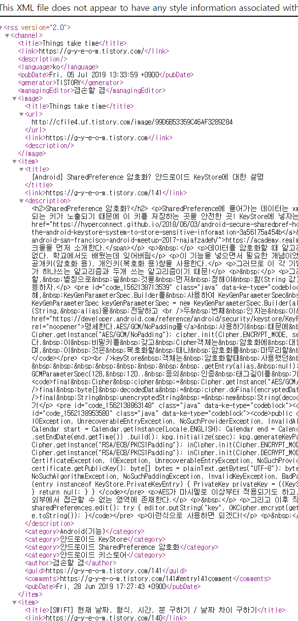 티스토리에서도 제공하게 되는데 예를 들어, 현재 티스토리는 주소 끝에 /rss를 붙이면 아래와 같은 데이터가 제공된다.